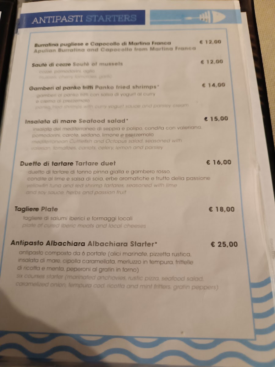 Welcome to Lido AlbaChiara, a picturesque seaside restaurant nestled along Lungomare C. Colombo in Santa Maria di Leuca, Italy. Here, dining transcends mere food—it's an experience enriched by stunning sea views and gentle breezes. The menu showcases a delightful assortment of fresh seafood, with highly praised dishes like troccoli alle vongole capturing the essence of Italian culinary tradition. Guests rave about the grilled shrimp and octopus salad, highlighting the freshness that sets this venue apart. While some reviews note minor service hiccups and a limited wine selection, the efficient and friendly staff overwhelmingly contribute to a welcoming atmosphere.
